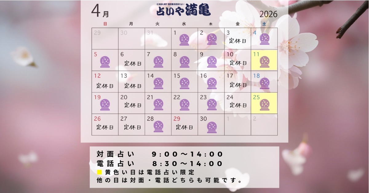 営業時間: 8時30分〜14時00分 (各在籍占い師によって異なります)